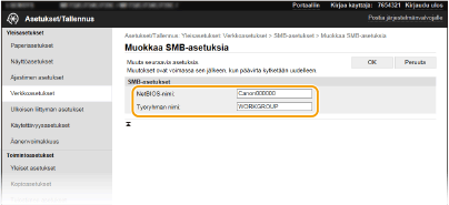 SMB (Server Message Block) on protokolla, jolla jaetaan resursseja, kuten tiedostoja ja tulostimia, useamman kuin yhden verkossa olevan laitteen kanssa. Laite käyttää SMB-protokollaa skannattujen asiakirjojen tallentamiseen jaettuun kansioon. Verkosta riippuen voit joutua asettamaan NetBIOS-nimen ja työryhmän nimen.