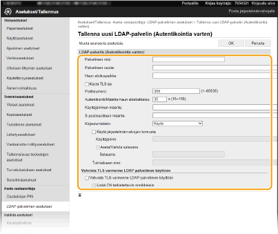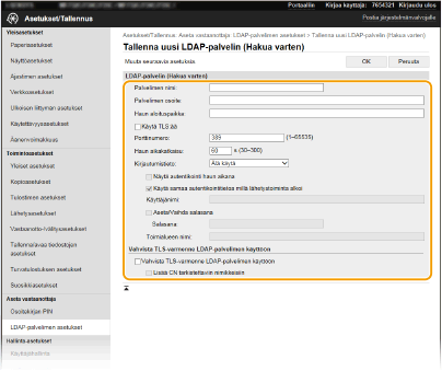 LDAP-palvelimen rekisteröinti täytyy suorittaa erikseen joko hakua tai todennusta varten. Jos haluat käyttää LDAP-palvelinta faksien ja sähköpostin vastaanottajien hakemiseen, rekisteröi se hakua varten. Jos haluat käyttää sitä sähköpostien ja faksien todennukseen, rekisteröi se todennusta varten.