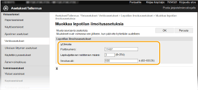 <Käytä nimettyä porttia> Laitteen valvonta ja ohjaus SNMP:n avulla Etäkäyttöliittymän toiminnotLisätietoja suoritettavista perustoimenpiteistä, kun laitteen asetukset tehdään etäkäyttöliittymästä on kohdassa Valikkovaihtoehtojen asettaminen Etäkäyttöliittymästä.