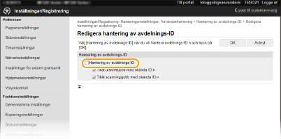Markera kryssrutan för att aktivera Hantering av avdelnings-ID. Om du inte vill använda funktionen avmarkerar du kryssrutan.