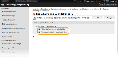 Aktivera Hantering av avdelnings-ID för jobb från en dator). Om kryssrutan för den här inställningen är markerad kan du dock skicka jobb utan att ange ID och PIN-kod. Avmarkera kryssrutan om du vill att rätt avdelnings-ID och PIN-kod ska behöva anges.