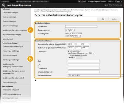 En nyckel och certifikat kan genereras med enheten när det krävs för krypterad kommunikation via TLS (Transport Layer Security). Du kan använda TLS när du använder enheten via Fjärranvändargränssnittet. Självsignerade certifikat används tillsammans med nyckeln och certifikatet som har skapats i "Nätverkskommunikation".
