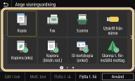 Du kan lägga till snabbvalsknappar på skärmen Hem för funktioner som du ofta använder, t.ex. <Kopia>, <Fax> och <Scanna>. Du kan exempelvis utföra uppgifter snabbare och effektivare genom att tilldela en sekvens av inställningar (t.ex. "Skanna båda sidorna av originalet, spara dem som en högkomprimerad PDF-fil och skicka filen via e-post") till en enda knapp.