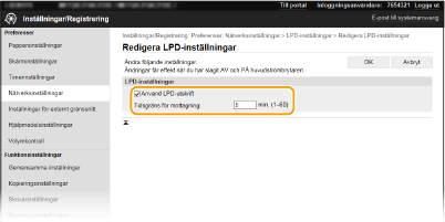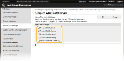 Markera kryssrutan om du vill hämta information om enheten från en dator via WSD. Kryssrutan markeras automatiskt när kryssrutan [Använd WSD-utskrift] är markerad. [Använd WSD-scanner]