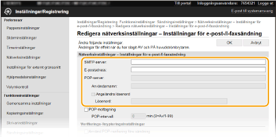 Använd Fjärranvändargränssnittet för att konfigurera de detaljerade sänd- och mottagningsinställningarna, såsom inställningarna för att använda enheten för att skicka och ta emot I-fax och inställningarna för POP-autentisering och kryptering av kommunikation innan du skickar e-post eller I-fax. Kontakta din leverantör eller nätverksadministratör för nödvändiga inställningar.