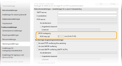 Detta ställer in intervallet (i minuter) som används för att automatiskt ansluta till POP3-servern. Om det finns I-fax-dokument på servern tas de automatiskt emot och skrivs ut.