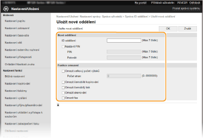 Uložte ID oddělení a nastavte pro ně kód PIN. Uložte všechna ID oddělení, která chcete spravovat.