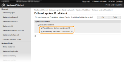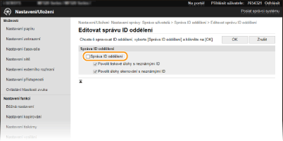 Zaškrtnutím políčka aktivujte správu ID oddělení. Pokud funkci správy ID oddělení nechcete dále používat, zrušte zaškrtnutí políčka.