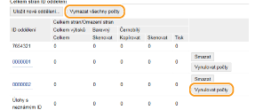 Chcete-li nastavit počet opět na nulu, klikněte na příslušný textový odkaz pod [ID oddělení] a klikněte na [Vynulovat počty]  [OK]. Chcete-li nastavit počet na nulu pro všechna ID oddělení, klikněte na [Vymazat všechny počty]  [OK].