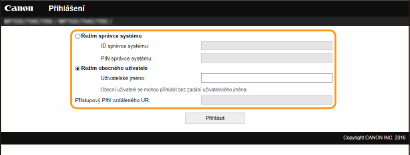Prostřednictvím Vzdáleného uživatelského rozhraní můžete provádět všechny operace a nastavení. Zadejte příslušné ID do pole [ID správce systému] a PIN do pole [PIN správce systému].