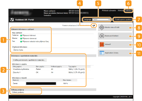 Když se přihlásíte do Vzdáleného uživatelského rozhraní, objeví se následující stránka portálu. V této části jsou popsány položky zobrazené na stránce portálu a základní operace.