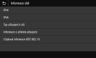 Zobrazuje nastavení sítě, jako je adresa IP zařízení, a stav, například komunikací v bezdrátové síti LAN.