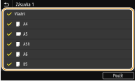 Velikosti papíru, které nejsou vybrané, lze zobrazit výběrem možnosti <Jiné velikosti> na obrazovce pro volbu nastavení velikosti papíru.