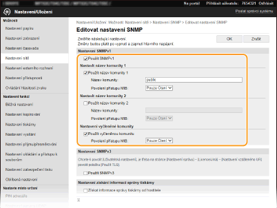 SNMP (Simple Network Management Protocol) je protokol určený k monitorování a ovládání komunikačních zařízení v síti pomocí funkce MIB (Management Information Base). Zařízení podporuje protokol SNMPv1 a protokol SNMPv3 s vylepšenými funkcemi zabezpečení. Stav zařízení lze zkontrolovat z počítače při tisku dokumentů nebo pomocí Vzdáleného uživatelského rozhraní. Můžete povolit buď protokol SNMPv1, nebo SNMPv3, případně oba současně. U každé verze zadejte nastavení odpovídající síťovému prostředí a účelům používání.