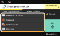 Ha ki van választva egy rendeltetési hely a <Címjegyzék> menüből a Főképernyő képernyőn, akkor megjeleníthető az Alapvető funkciók képernyő az i-Fax küldéshez, miközben a kiválasztott rendeltetési hely marad megadva.