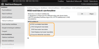 WSD-n keresztüli nyomtatáshoz jelölje be ezt a jelölőnégyzetet. Ha nem használ WSD-nyomtatást, akkor törölje a jelet a jelölőnégyzetből. [WSD-böngészés használata]