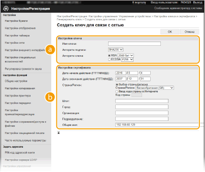 Если значение [SHA384] или [SHA512] выбрано в поле [Алгоритм подписи], невозможно выбрать значение [512 бит] в качестве длины ключа, если значение [RSA] выбрано в поле [Алгоритм ключа].