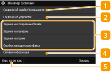 При выборе пункта <Монитор сост.> отображается экран, позволяющий просматривать ход обработки документов. Кроме того, на экране отображается информация о состоянии аппарата (оставшееся количество тонера в картриджах и пр.) и такие сведения о параметрах сети, как IP-адрес аппарата.