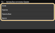 Можно включить или отключить автоматический выбор источника бумаги для каждого из источников бумаги. Если для этой функции задано значение <Вкл.>, аппарат для каждого задания печати автоматически выбирает источник бумаги, в который загружена бумага подходящего формата. Кроме того, если в выбранном источнике заканчивается бумага, эта функция обеспечивает бесперебойную печать путем переключения с этого источника бумаги на другой источник, в который загружена бумага того же формата.