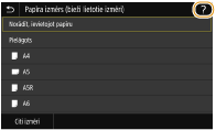 Dažos ekrānos ir pieejama poga <?>, ko varat izmantot, lai skatītu funkciju aprakstus vai informāciju par darbībām.