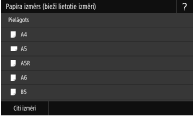 Ja iepriekš redzamais ekrāns netiek rādīts, ievietojot papīruJa universālajā teknē vienmēr ievietojat vienu un to pašu papīra formātu, varat izlaist papīra iestatīšanas darbības, reģistrējot papīra formātu un veidu kā noklusējuma iestatījumu. Reģistrējot noklusējuma iestatījumu, iepriekš redzamais ekrāns netiek parādīts. Lai parādītu ekrānu, izvēlieties <Norādīt, ievietojot papīru> (Noklusējuma papīra iestatījumu reģistrēšana daudzfunkciju papīrturim).