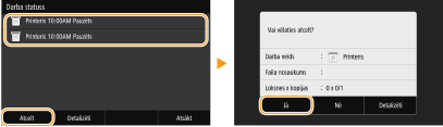 Atcelšana, izmantojot utilītprogrammu Remote UI (Attālais lietotāja interfeiss)Drukāšanu var atcelt utilītprogrammas Remote UI (Attālais lietotāja interfeiss) lapā [Job Status]: Izdrukāto dokumentu pašreizējā statusa pārbaude