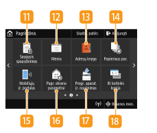 <Būsenos mon.>Paspauskite, jei norite patikrinti spausdinimo būseną, peržiūrėti naudojimo istoriją arba aparato tinklo parametrus, pvz., IP adresą. Taip pat galima patikrinti aparato būseną, pavyzdžiui, popieriaus likutį arba dažomųjų miltelių lygį kasetėse, arba peržiūrėti, ar neįvyko klaidų. Ekranas <Būsenos ekranas>