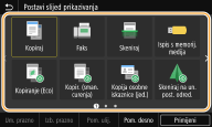 Na Početni zaslon možete dodavati gumbe prečaca za najčešće funkcije kao što su <Kopiraj>, <Faks> i <Skeniraj>. Primjerice, možete izvršavati zadatke brže i učinkovitije dodjeljivanjem slijeda postavki (npr. „Skeniranje obiju stranica izvornika, spremanje u obliku jako komprimiranih PDF datoteka i slanje e-poštom“) na jedan gumb.