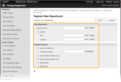 [Restrict Functions] За всеки от отделите, които запаметявате, можете да ограничите броя на страниците за печатане и достъпните функции. За да ограничите броя на страниците за печат, поставете отметка в квадратчето за желания тип печат и въведете разрешения брой страници в полето [Number of Pages]. Поставете отметки в квадратчетата за функциите, които искате да ограничите.