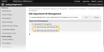Разрешаване на функцията за управление на кодове на отдели за задачи, изпратени от компютър). Ако обаче в квадратчето за тази настройка е поставена отметка, задачите се изпълняват дори ако не са въведени ID и PIN код. Ако искате да конфигурирате настройката така, че да не може да се изпълняват задачи, освен ако не бъдат въведени правилни ID и PIN код, махнете отметката от това квадратче.