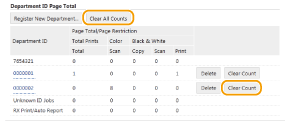 Ако желаете да нулирате броячите, щракнете върху съответната текстова връзка под [Department ID] и щракнете върху [Clear Count]  [OK]. Ако желаете да нулирате броячите на всички кодове на отдели, щракнете върху [Clear All Counts]  [OK].