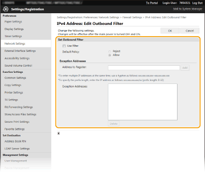 Ако IP адресите са въведени неправилно, може да не успеете да отворите устройството от Remote UI (Потребителски интерфейс за отдалечено управление), като в този случай е необходимо да зададете <Филтър за IPv4 адрес> или <Филтър за IPv6 адрес> на <Изкл.>.