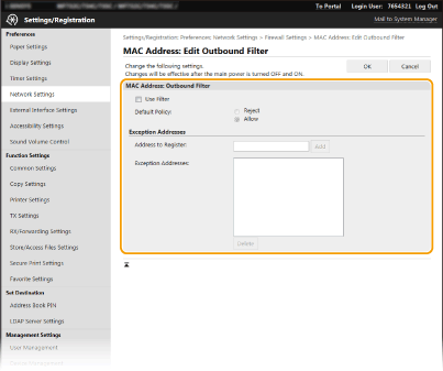 Ако MAC адресите са въведени неправилно, може да не успеете да отворите устройството от Remote UI (Потребителски интерфейс за отдалечено управление), като в този случай е необходимо да зададете <Филтър за MAC адрес> на <Изкл.>. <Филтър за MAC адрес>