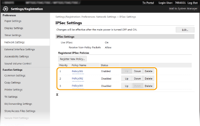 Използване на работния панелМожете да разрешите или забраните шифрованата с IPSec комуникация също и от <Меню> в екрана Начало. <Използване на IPSec>