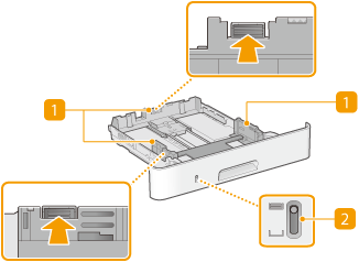 Регулирайте водачите точно спрямо формата на заредената хартия, за да гарантирате, че хартията ще се подава право в устройството. Натиснете лостчетата за освобождаване на заключването, обозначени със стрелки в илюстрациите, за да освободите блокировките и да плъзгате водачите за хартията.