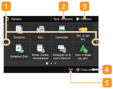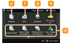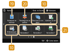 <Статус монит.>Натиснете го, за да проверите състоянието на отпечатване, да прегледате хронологията на използване или настройките на мрежата, например IP адреса на устройството. Можете също така да проверите състоянието на устройството, като например оставащи количества хартия и тонер, или дали не са възниквали грешки. Екран <Статус монитор>