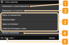 Когато натиснете <Статус монит.>, се показва екран, в който можете да проверите напредъка на обработката на документ, състоянието на устройството (количеството тонер, оставащо в тонер касетите, и т.н.) и мрежовите настройки, като например IP адреса на устройството.