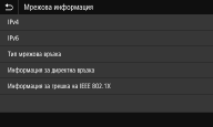 Показва мрежовите настройки, като напр. IP адреса на устройството, и състоянието, като напр. условията за безжична LAN комуникация.