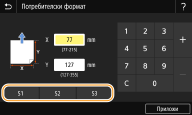 Форматите на хартията, запаметени чрез процедурата по-горе, могат да бъдат извикани, когато сте избрали настройка <Потребителска> в екрана за избор на формат на хартията за касетата за хартия или многофункционалната тава.