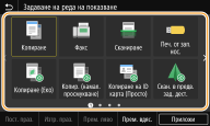 Можете да добавите бутони за пряк път в екрана Начало за често използвани функции, като например <Копиране>, <Факс> и <Сканиране>. Можете например да извършвате задачи по-бързо и ефективно, като присвоите последователност от настройки (например "сканиране на двете страни на оригинал, записване като силно компресиран PDF файл и изпращане по имейл") към един-единствен бутон.