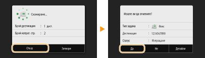 Ако искате да отмените изпращането на факсове веднага след избирането на <Старт>, изберете <Отказ> на дисплея или натиснете на работния панел. Можете също така да отмените изпращането на факсове след проверка на състоянието на факс.