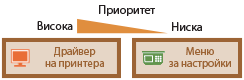 Ако в драйвера на принтера и работния панел бъдат зададени различни настройки за печат, настройките, зададени в драйвера на принтера, са с приоритет пред тези, зададени от работния панел. Зададените в работния панел настройки се прилагат в някои конкретни случаи, например при провеждане на PS/PCL печатане или печатане от UNIX или друга операционна система, която не поддържа драйвери на принтери.