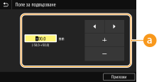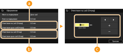 Задайте отместването на позицията за печат, за да настроите ширина на полето за подвързване, чиято позиция сте избрали в <Място за подвързване>. Стойността "00,0" не упражнява никакво влияние върху полето за подвързване.