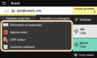 Ако изберете дестинация от <Адресна книга> в екрана Начало, екранът с основни функции за изпращане на имейл или записване на файл може да се изведе, докато дестинацията остава избрана.