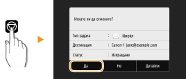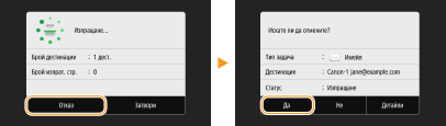 Ако искате да отмените изпращането на документи веднага след избирането на <Старт>, изберете <Отказ> на дисплея или натиснете . Можете също така да отмените изпращането на документи след проверка на състоянието на изпращане.