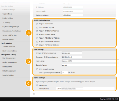 Поставете отметка в квадратчето за динамично обновяване на DNS записите при всяка промяна на IP адреса на устройството. Когато задавате период от време между обновленията, задайте времето в часове в текстовото поле [DNS Dynamic Update Interval]. [mDNS Settings][Use mDNS]