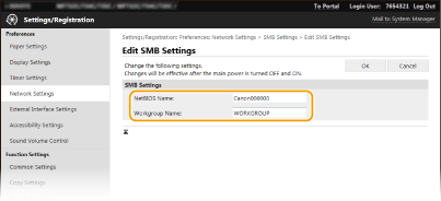 SMB (Server Message Block) е протокол за споделяне на ресурси, като файлове и принтери, с повече от едно устройство в мрежата. Устройството използва SMB, за да съхранява сканираните документи в споделена папка. В зависимост от мрежата ви може да се наложи да зададете NetBIOS име и име на работна група.