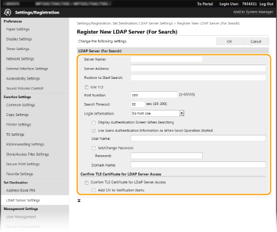 Запаметяването на LDAP сървър трябва да се извършва разделено или за търсене, или за удостоверяване. За да използвате LDAP сървър за търсене на дестинации за факс и имейл, запаметете го за търсене, а за да го използвате за удостоверяване при изпращане на имейл или факс, запаметете го за удостоверяване.