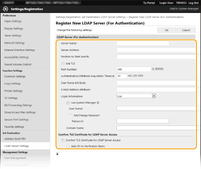 Изберете [Do Not Use], [Use] или [Use (Security Authentication)] в зависимост от типа удостоверяване, използван от LDAP сървъра. Ако сте избрали [Use] или [Use (Security Authentication)], трябва да зададете потребителско име и парола.