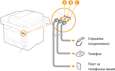 Свържете включения в комплекта телефонен кабел към порта за телефонна линия на устройството (
